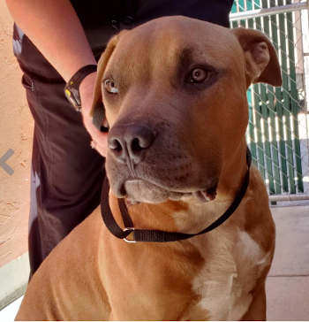 This young male American pit bull has a short brown coat.