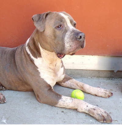 “Brutus” is a 5-year-old male pit bull terrier with a short gray and white coat.