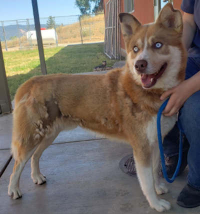 “Apollo” is a 2-year-old male husky mix with a medium-length red and white coat and blue eyes.