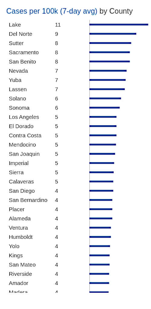 On Wednesday, the California Department of Public Health reported that Lake County’s cases per 100,000 over a seven-day average had edged up further still, to 11, remaining the highest daily case rate in California.