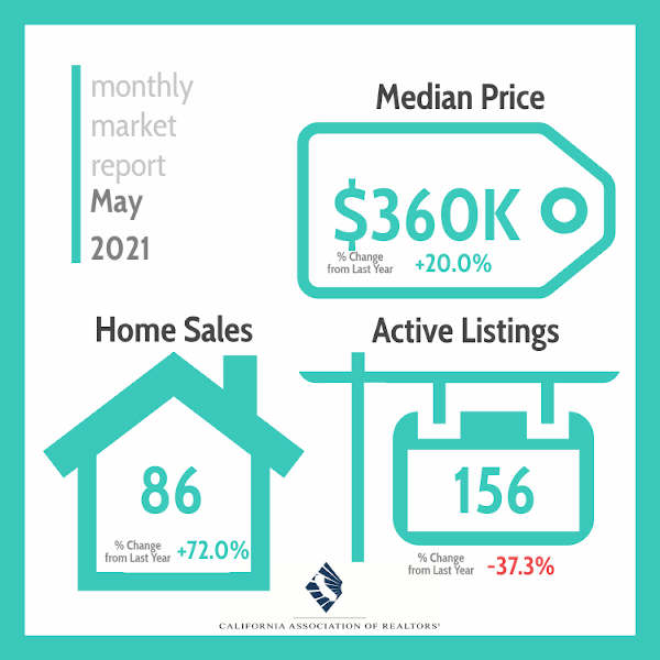 Kelseyville: The median home price in May was $450,000, up 50% from a year ago. That shows that in May 2021 there were some higher-priced homes sold when compared to May 2020.