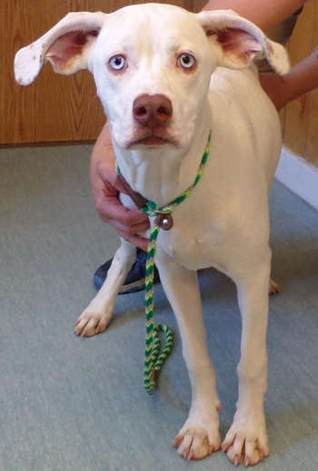 This young female Labrador-Weimaraner mix has a short white coat and blue eyes.