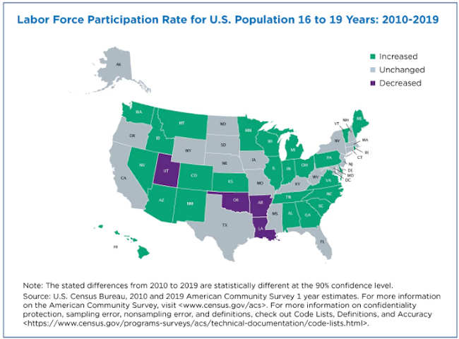 However, just as it played out nationally, labor force participation rates went up in most states in every age group from 2010 to 2019: