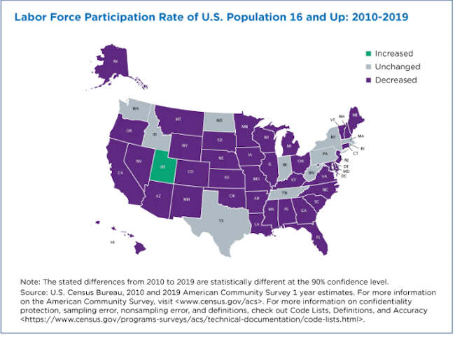 Only one state (Utah) and the District of Columbia experienced increases in their labor force participation rates for the total working-age population ages 16 and older while 38 states experienced decreases.