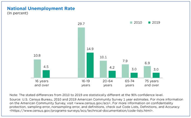 The unemployment rates of the population ages 65 to 74 and 75 and older were lower than the unemployment rates of the population ages 16 to 19 and 20 to 64, in both 2010 and 2019.