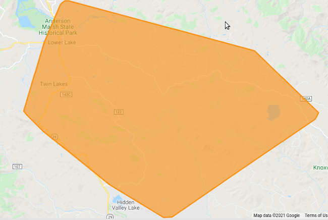 As of 6:03 p.m., power was reported to be out to 2,584 customers in an area stretching from Clearlake to Hidden Valley Lake. As of that time, Pacific Gas and Electric Co. had not confirmed that the outage was a direct result of the fire.