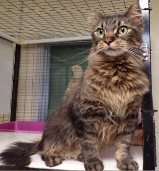 “Cozette” is a female domestic longhair with a brown tabby coat.