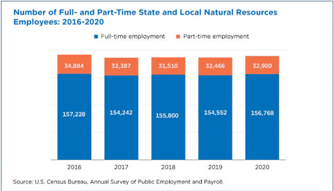 According to the Census Bureau’s Annual Survey of Public Employment & Payroll, in March 2020 there were 189,668 employees in the natural resources functions of state and local governments: 83% (156,768) were full-time and 17% (32,900) part-time.