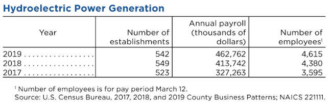 For example, there was about a 5% increase in the number of hydroelectric power generation establishments and a 22% rise in the number of people employed in the industry from 2017 to 2018. The 2019 data show fewer establishments with an increase in the number of employees in the sector.