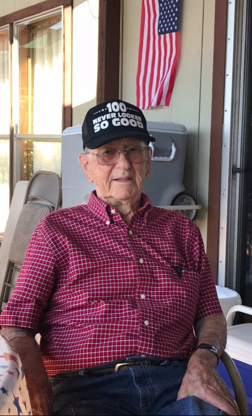 Though Bob is 100 years old he still gardens, cuts up his own firewood, mows his three-acre property with his tractor, and goes fishing with his good friend Doug Patten.