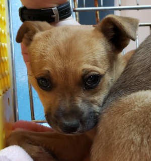 This female German shepherd mix puppy has a short tan coat.
