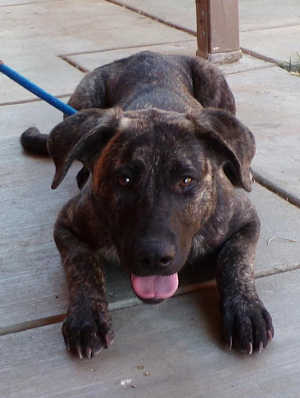 This young female Belgian malinois mix has a short brown brindle coat.