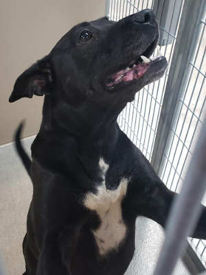 “Sassy” is a female Labrador retriever and pit bull mix with a short black with white markings.