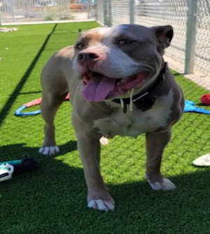 “Dusty” is a male American Pit Bull Terrier with a tan and white coat.