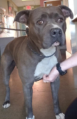 “Brutus” is a male pit bull terrier with a short gray and white coat.