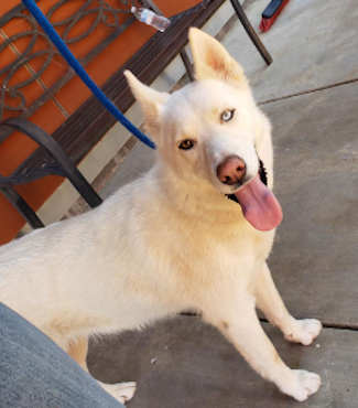 “Ghost” is as male husky mix with a white coat and blue eyes.