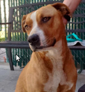This female pit bull terrier has a short red and white coat.