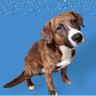 This male corgi-shepherd mix has a short brown and brindle coat.