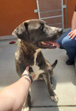 “Brutus” is a male pit bull terrier with a short gray and white coat.