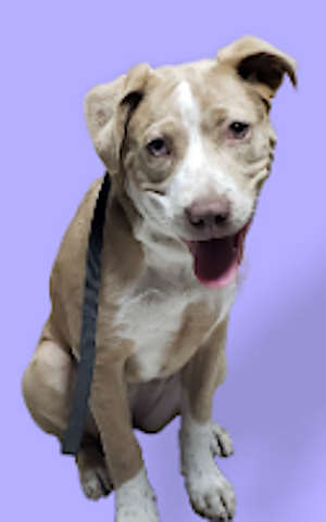 “Abigail” is a young female pit bull terrier with a short tan and white coat.