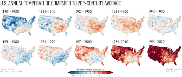 In the image below, we’ve compared the U.S. annual average temperature during each Normals period to the 20th-century average (1901-2000).