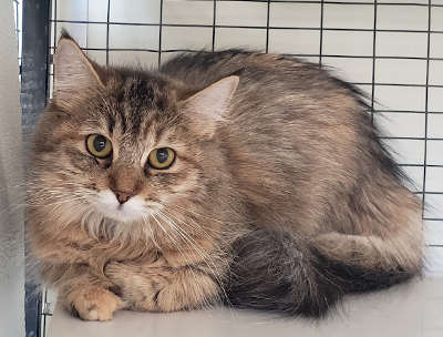 “Ruby” is a female domestic long hair with a brown coat and gold eyes.