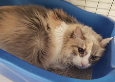 “Moxi” is a female domestic longhair with a calico coat and blue eyes.
