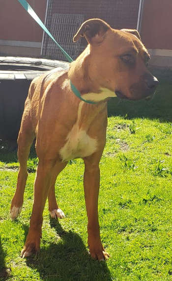 “Sophie” is a female boxer-pit bull mix with a short red coat.