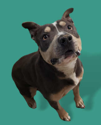 “Rocky” is a male pit bull terrier with a short black coat.
