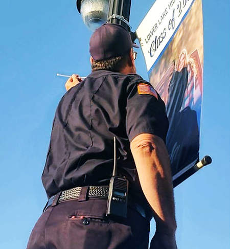 Lake County Fire Protection District Chief Willie Sapeta installs banners on popular traffic routes to honor Konocti Unified seniors in Lake County, California. Courtesy photo. Sapeta thought last year would be the only year she would do something like this, but the pandemic lasted longer than anyone expected.