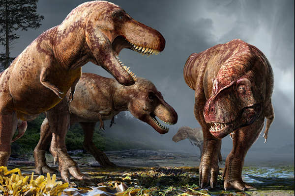 Over approximately 2.5 million years, North America likely hosted 2.5 billion Tyrannosaurus rexes, a minuscule proportion of which have been dug up and studied by paleontologists, according to a UC Berkeley study. Image by Julius Csotonyi, courtesy of Science magazine. How many Tyrannosaurus rexes roamed North America during the Cretaceous period?
