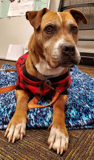 “Dusty” is a male American Pit Bull Terrier with a tan and white coat.