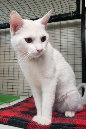 This male domestic short hair cat has a white coat and gold eyes.