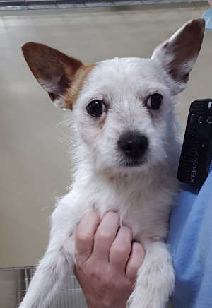 This young male terrier has a coarse white coat with brown markings.