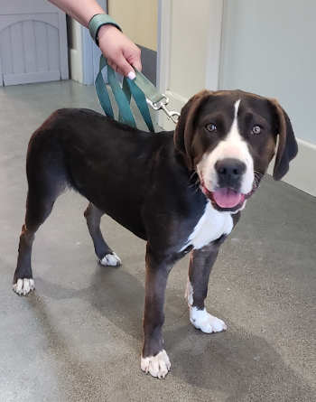 “Sanders” is a young male hound mix with a short black and white coat.