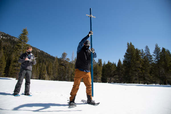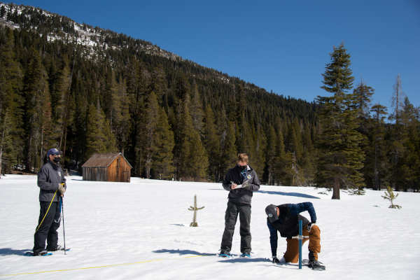 The manual survey recorded 49.5 inches of snow depth and a snow water equivalent, or SWE, of 21 inches, which is 83 percent of average for this location. The SWE measures the amount of water contained in the snowpack and is a key component of DWR’s water supply forecast.