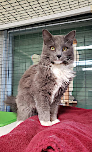 This young male domestic longhair cat has a gray and white coat and gold eyes.