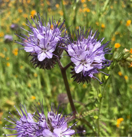Phacelia tanacetifolia is an attention-grabber not only for your eyes and nose, this wildflower native to Lake County and the southwestern United States and northern Mexico, is used in many places as a hedgerow on farms, as it attracts bees and other beneficial insects.