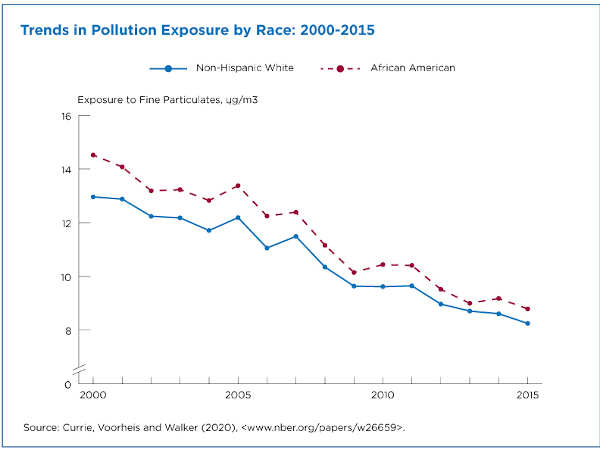 A Census working paper from 2020 shows that African Americans were exposed to higher levels of particulate matter than Whites, although this gap has narrowed in the last two decades.