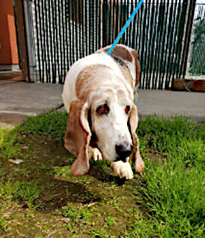 “Molly” is a senior female basset hound with a short tan and white coat.