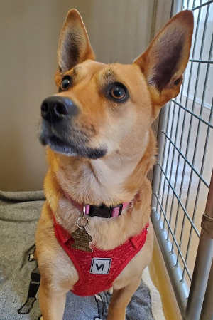 “Sarah” is a female terrier mix with a short tan coat.