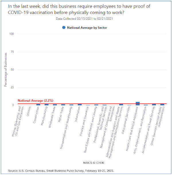 Most of the nation’s small businesses do not require employees to get COVID-19 vaccines or tests to return to work, according to the first results of Phase 4 of the U.S. Census Bureau’s Small Business Pulse Survey, or SBPS, released last week.
