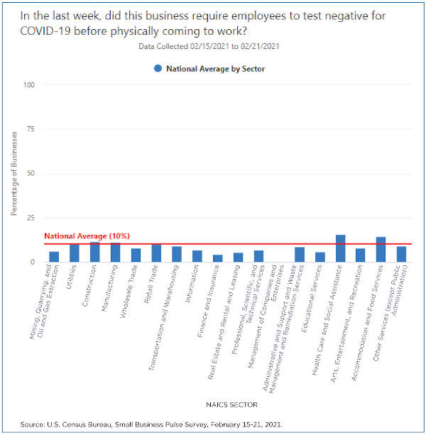 Responses: 10.0% said yes; 70.1% said no; and 19.9% said not applicable or n/a. Responses in two specific sectors outpaced the national average: 15.5% of health care and 14.3% of accommodation/food service businesses for requiring a negative test.