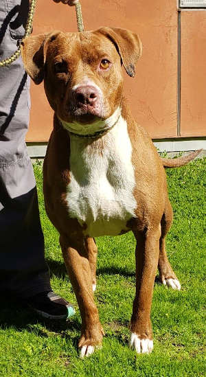 This female pit bull terrier has a short red coat.