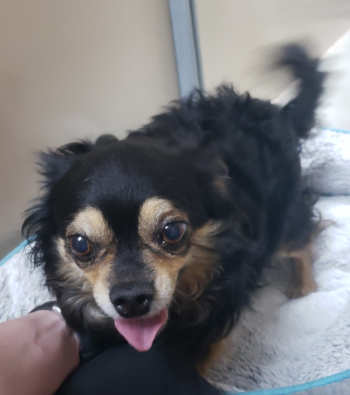 This female Chihuahua-pug mix has a long black and brown coat.
