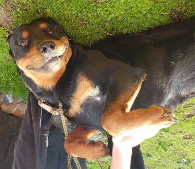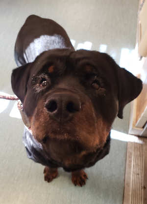 “Sargent Chunk” is a young male Rottweiler with a short red and black coat.