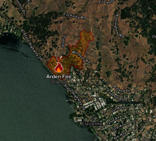 On Sunday morning, traffic control remained in effect in the area of Highway 20 and Foothill Drive on the west end of Lucerne, as firefighters and utility workers continued their efforts to fully contain the fire and deal with the infrastructure damage.