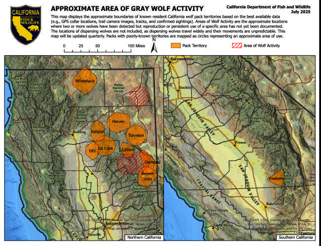 During the second quarter of 2025, one male wolf from the Beyem Seyo pack made his way into Oregon. And a female Beyem Seyo wolf roamed several hundred miles south to join up with the Yowlumni pack in Tulare County. Two wolves of unknown origin were detected separately in the Tehachapi Mountains in Kern County.