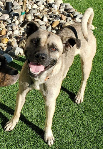 He has a short tan and black coat.