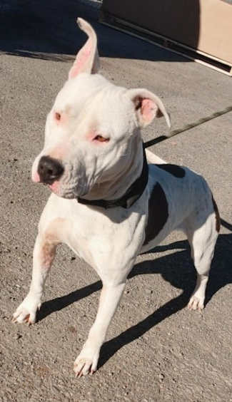 “Mommas” is a female American Pit Bull terrier mix with a white coat.